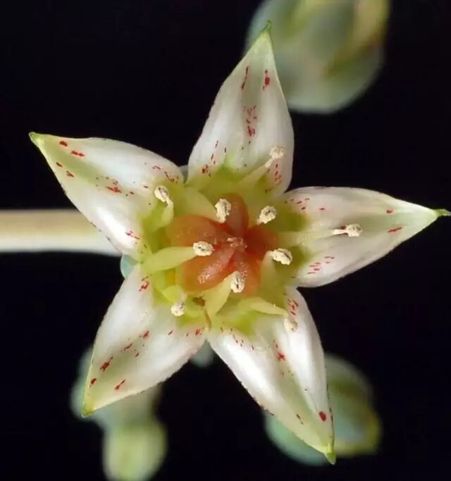 每年的春夏之交是胧月的花期,一枝枝花梗从叶腋中抽出,花梗分支很多,这种“横生枝节”造就了与众不同的美感。胧月的花朵不大,花瓣平展呈五角星形,上面有一些红色的缟斑,花丝往外翻着,比较奇特。也难怪,本来风车草属的属名Graptopetalum,就是“花瓣上铭刻着红色斑纹”之意。