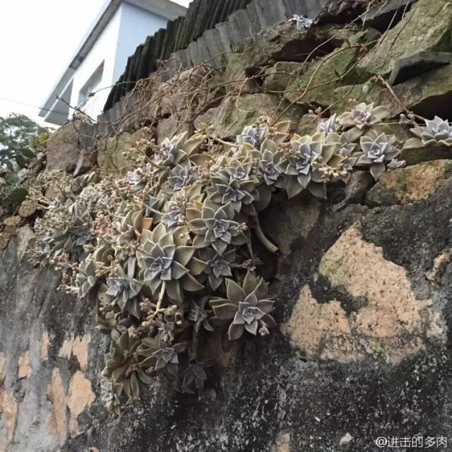 现在,城里的宝石花瀑布不再常见。由于多肉植物的走红,改名“胧月”的宝石花随着势不可挡的多肉大军,涌入了千家万户。相比那些妖冶艳丽的拟石莲花属多肉,胧月一直被冠以“猪肝色”“皮实”等略带嫌弃意味的头衔,地位并没有提高多少,直至今日,胧月还是最普通、最便宜、最底层的多肉之一。可是,我就是喜欢胧月这样,卑微而不卑贱,朴实而有才华。