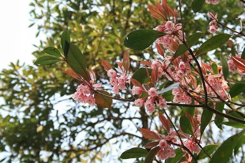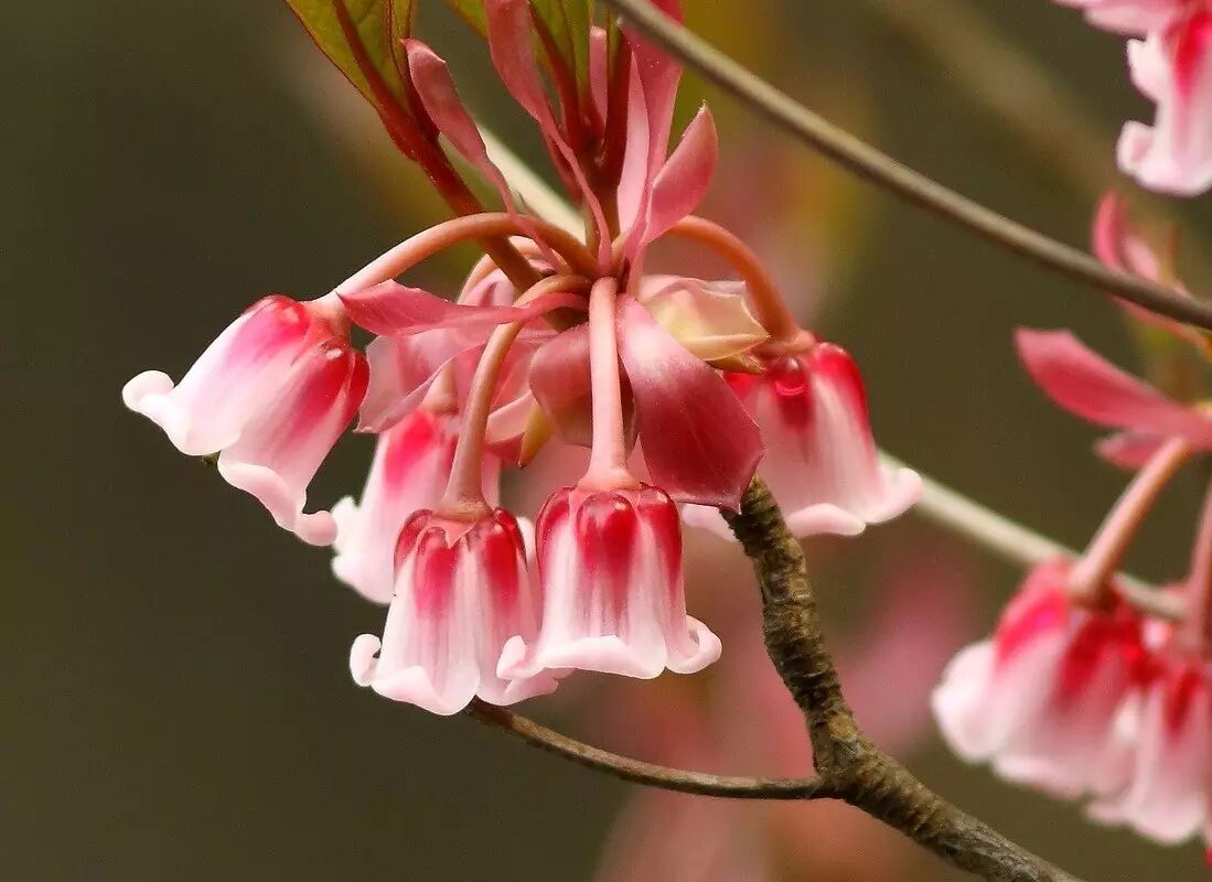 初绽放时,吊钟花浅红嫩绿的新叶和苞片其实比花朵更具观赏价值:不光颜色鲜艳,表面还有蜡质光泽,看起来颇似人造的工艺品。随着叶片慢慢舒展,花朵也渐渐从绿色变成红色,继而绽放。盛开后的花朵花萼鲜红,浅粉红色的花冠边缘向外反卷,看上去就像一个个晶莹剔透的小吊钟,吊钟花一名也由此而来。成功授粉后的小花会在花期过后几个月发育成五棱的果实,成熟开裂后散落出其中的黑色种子。