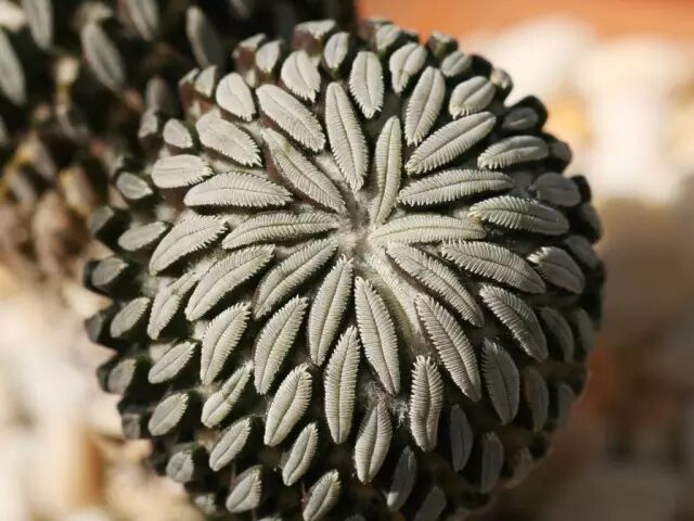 另外,一些仙人掌的刺还有迷惑捕食者的作用,比如精巧丸Pelecyphora aselliformis,它们的刺从刺座中心向两边密集生长,紧贴在茎上,就像爬满了一只只的毛毛虫,以这种假象警告捕食者:我有毒哦,你吃你遭殃。实际它们的刺是没有毒性的。