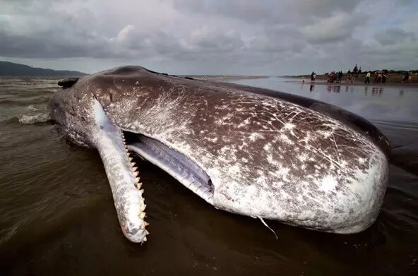虽然是世界上现存最大的齿鲸,抹香鲸的双颌却显得十分短小和狭窄,下颌上稀疏排列着长约20厘米的圆锥型牙齿,远远看去酷似一把电锯。和它的庞大身躯相比,这些高度退化的牙齿显得格外细小。深灰色的、充满褶皱的表皮包裹在抹香鲸厚达十几厘米的脂肪外,上面常常会出现些奇怪的圆形刮痕,那是猎物在它身上留下的印记。<戳这,看密恐的圆形刮痕>