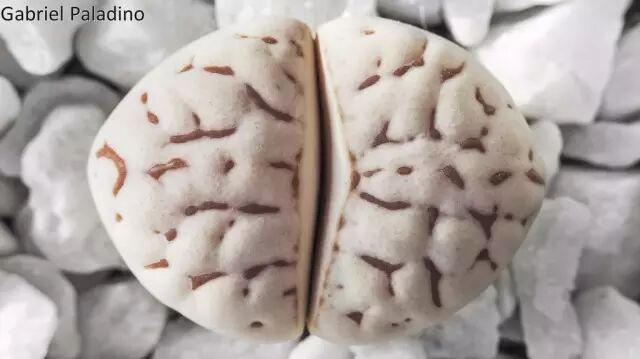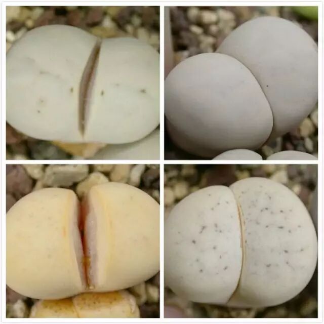 不过你会发现,为啥我发的留蝶玉的窗面有些光滑没有纹理,有些却有呢?其实留蝶玉分为两个变种:Lithops ruschiorum var. ruschiorum和Lithops ruschiorum var. lineata,这两个变种逐渐发展成两个品系:无纹系和有纹系。