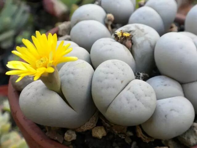 说生石花是植物界中的伪装大师,一点都不为过。根据种类品种不同,产地环境差异,生石花的窗面会呈现出各式各样的纹理,有凹陷如脑花的,有线状如涂鸦的,也有些窗面是半透明的,窗面颜色也多种多样,红赭色、淡紫色、碧绿色等。如此变化多端的窗面都是为了适应不同的环境,窗面的纹理和颜色跟产地的尘土沙砾很相近,能够和周遭的环境融为一体,令捕食者很难发现它们的存在,只有到了开花的时候才引人注目,这也就是所谓的“拟态”现象。所以希腊文里lithops的意思就是“石头表面”,非常形象贴切。