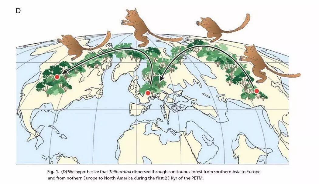 这要从约5550万年前的始新世之初说起。那时,随着新生的大西洋开始扩张,北美与亚欧大陆逐渐分手,而北大西洋还有陆桥藕断丝连。或许是大量火山活动让大气中二氧化碳浓度几千年中超过了1000ppm,地球上出现自恐龙灭绝后至今记录过的最暖气候(“古新世-始新世极热”,PETM)。当时,北半球高维度地区是许多热带物种的通道。