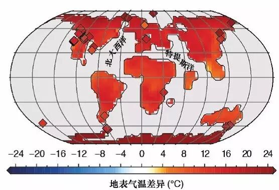 早始新世(5400~4800万年前)的大致地理格局,可见北大西洋陆桥、大西洋与特提斯洋。地表颜色显示当时的气温比现代平均气温高出许多。模拟数据/图片:Lunt / NOAA(2012)