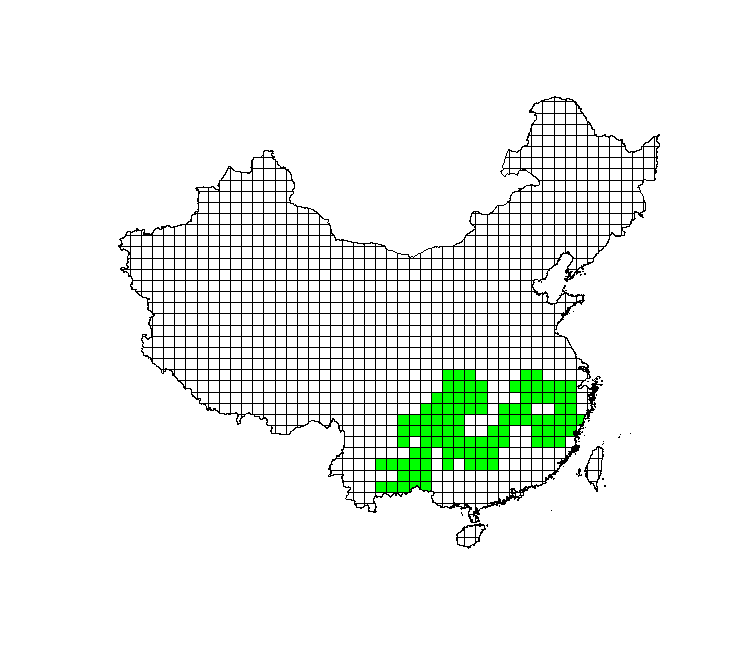 鹅掌楸在中国的大致分布范围,主要位于南方中低山地。图片:紫鹬;数据来源:《中国植物志》。