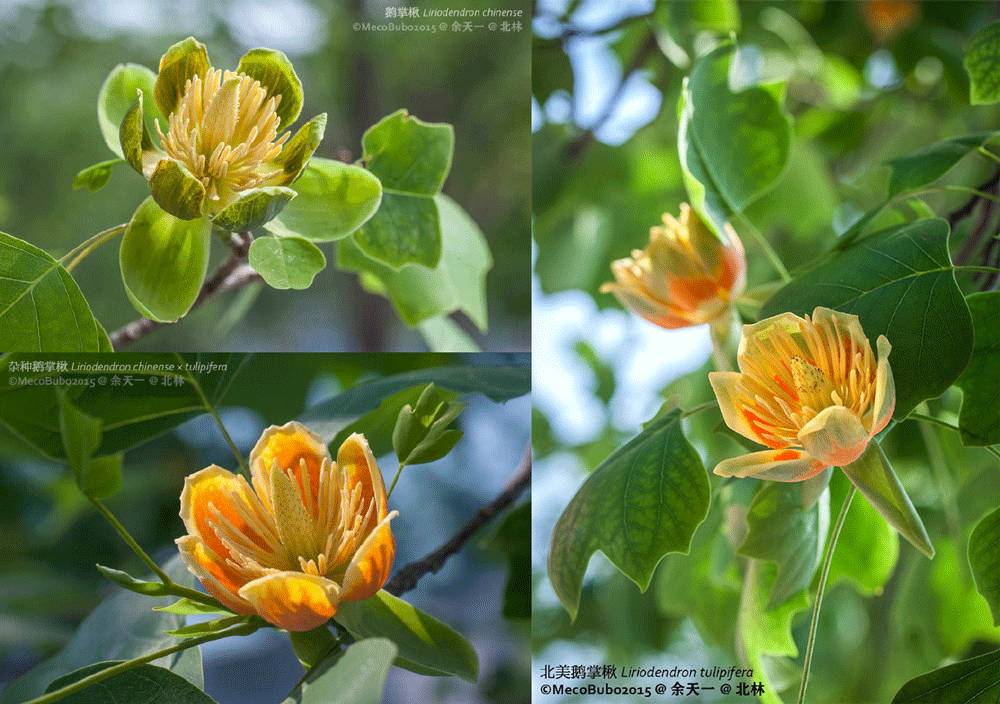 花朵对比。左上为鹅掌楸,右为北美鹅掌楸,左下为杂交鹅掌楸。图片:余天一