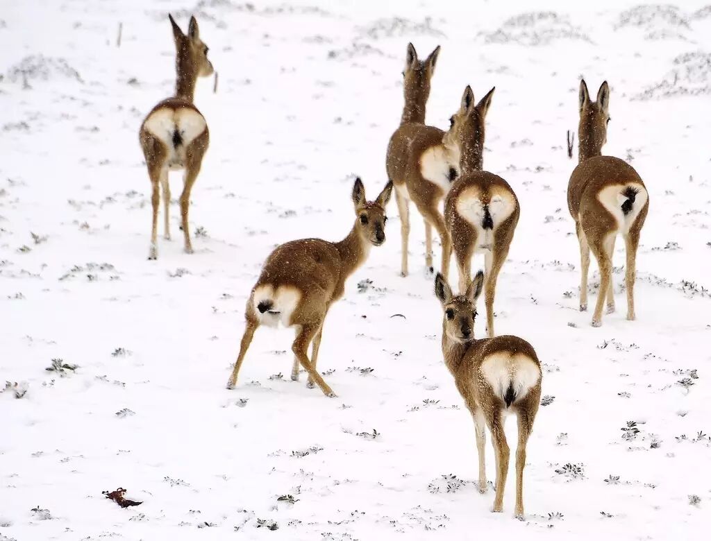 因为它显眼的白色臀斑,藏原羚被称为“白屁股”。大而呈心形的臀斑,可能是它最为显著的特征。在奔跑时竖直的毛会展开,边缘还有一圈红褐色的条纹。兽类臀斑肯定有着独特的功能和有趣的进化历程,不过我没找到详细的论述。一种说法是,成群逃避天敌时,跳跃的白屁股会晃花捕食者(主要是狼)的眼睛,不知道抓哪个好。还有人说,臀斑结合身体姿势,能更有效地表示臣服,避免种内的无谓争斗。