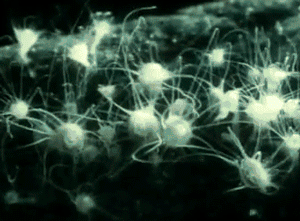 螅状体的无性繁殖,能看到视频中的螅状幼体逐渐发育成长,形成横裂体,一片片的碟状体从其顶端横向分裂脱落。最后一段是螅状体自身的出芽繁殖。图片:YouTube