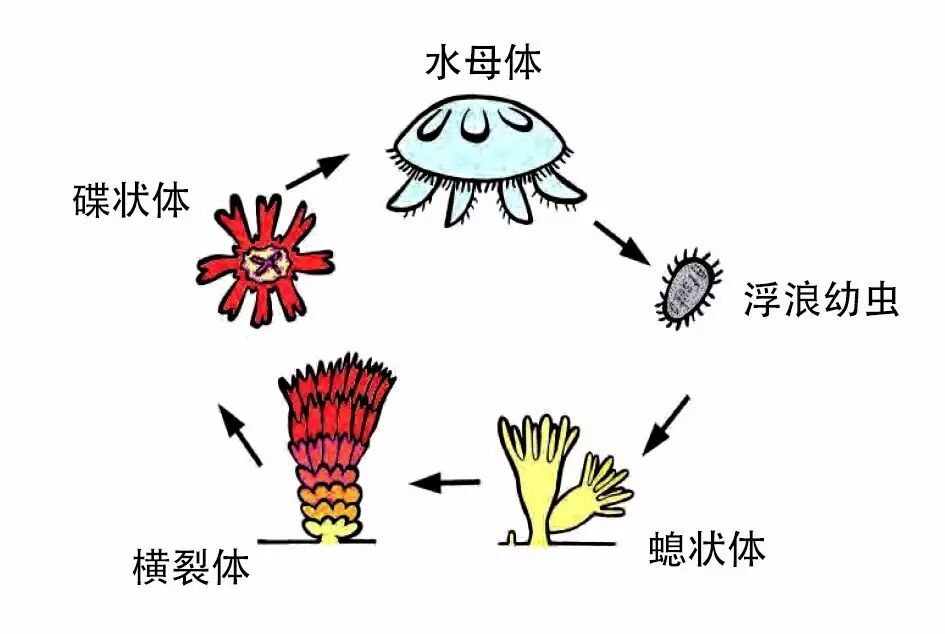 浮浪幼虫有细小的纤毛细胞,在离开雌性个体后可以浮游一日来寻找合适的底层定居。当它在附着在外物上之后,会介由出芽生殖形成螅状体,螅状体通过横向分裂脱落成一片片碟状幼体,长大后就成为了我们熟悉的水母体。