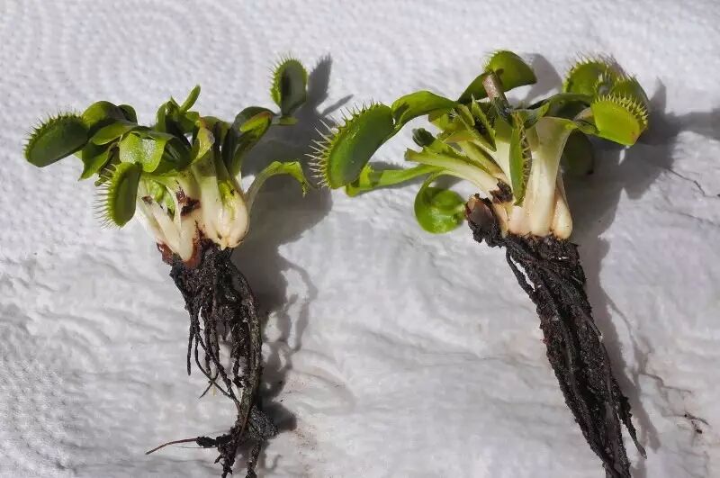 食肉植物的根很多都难以吸收无机盐,只起到固着和吸收水分的作用,捕蝇草也不例外,但它的根比较长,会一直往下扎,而不像大多数食肉植物一样是浅浅地扎根在基质表层。捕蝇草的茎很短,埋藏于地下形成鳞茎,也是它越冬的主要结构。