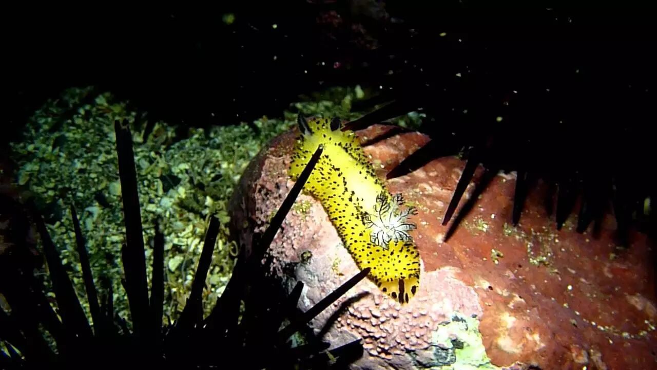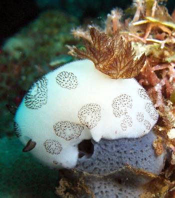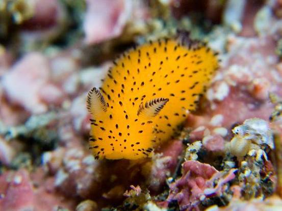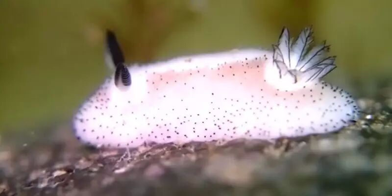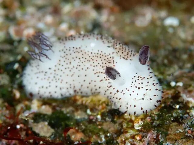 在我们的印象中,碎毛盘海蛞蝓应该就是黑白配色,但事实上,它们多为深黄色到深褐色,只有少数是黑白配。它们体侧的颜色在嗅角处和鳃处稍浅。另外,碎毛盘海蛞蝓身体背侧还分布有许多小黑点,这些小黑点实际上是由针状结构包围的感觉乳突,能起到一定的感觉作用。