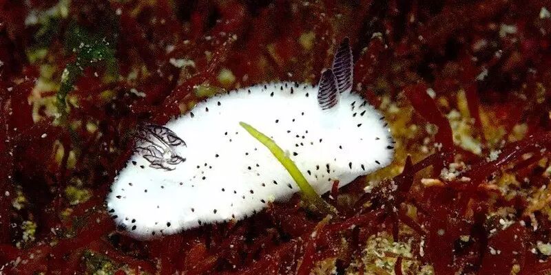 虽然属于腹足纲,但碎毛盘海蛞蝓的壳已经消失。失去了坚硬贝壳的保护,要想活命当然要另寻他法,于是,它们打起了食物的主意。裸鳃目的食谱包括海绵、海鞘、珊瑚、多毛类、苔藓虫等。