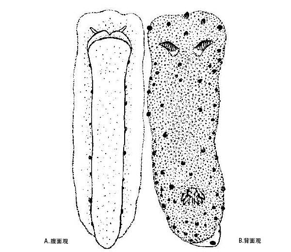 碎毛盘海蛞蝓的腹面及背面观。图片:Baba K./Journal of the Department of Agriculture(1938)