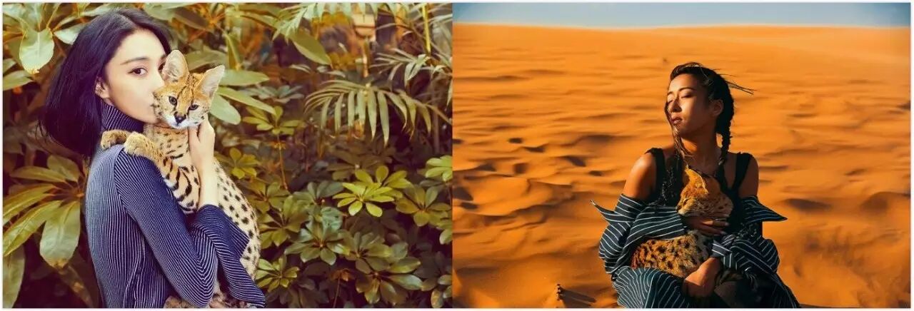 左:张馨予和薮猫 / 宠物世界·猫迷;右:吉克隽逸和薮猫 / 有宠YOURPET