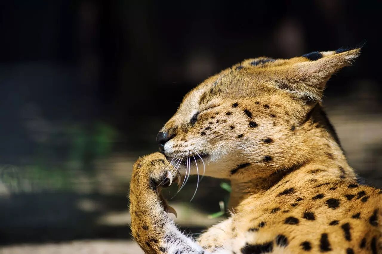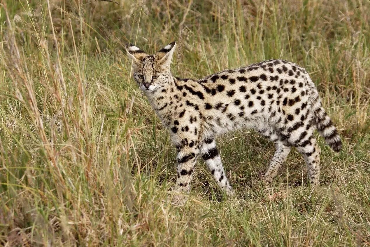 我们今天将要介绍的主角,有着非常帅气的外表,面部小巧狭长,双耳大而竖直,脖子长而优雅,还身披豹纹皮衣;在猫科动物的大家族中,它拥有相较于自身身体最大比例的卖萌双耳和最长比例的修长四肢。外观如此时尚,明星们当然不会错过与它同框拍摄时尚大片,它就是——薮[sǒu]猫(Leptailurus serval)。