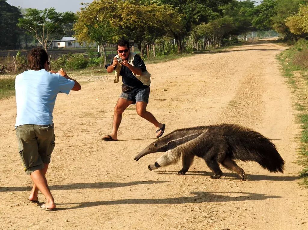 为了更专业地吃蚂蚁,食蚁兽也算没有辜负这幅长相:那对和树懒、犰狳一脉相承的前爪可以轻松地刨开蚁穴,也正是因此,它平常只能把巨爪窝在手心里,一路“拳行”;大食蚁兽拥有长而呈管状的吻,它的舌头长达半米(想象人类胃镜输送管的长度),表面密布黏液,每分钟可以吞吐150多次。食蚁兽简直是蚁穴的克星,然而在蚁穴附近的捕食过程不太好拍摄,请看下面这幅图。