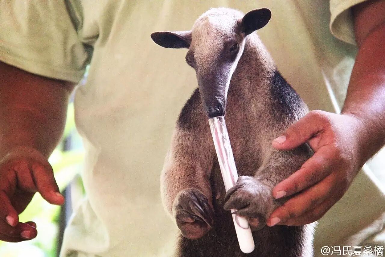 现在常见的做法是把猫粮、酸奶、牛肉、鸡蛋、水果等原料打成匀浆,过网细筛再给大食蚁兽吃,做得就跟人类的丝袜奶茶似的。没办法,谁让人家从嘴到脖子长得都跟个吸管似的……过得不够细,有可能会引起舌头坏死或肠梗阻。