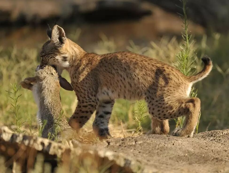如同加拿大猞猁钟爱雪鞋兔一样,伊比利亚猞猁的食谱中80%以上的猎物是穴兔,也就是家兔的野生祖先 <复习戳这里>。根据猎物的数量多少不同,它们也会偶尔尝试小型的有蹄类、鸟类和啮齿类动物,甚至动物尸体。一只成年猞猁需要平均每天捕食一只兔子,带着幼崽的雌性个体则需要抓到三只左右。