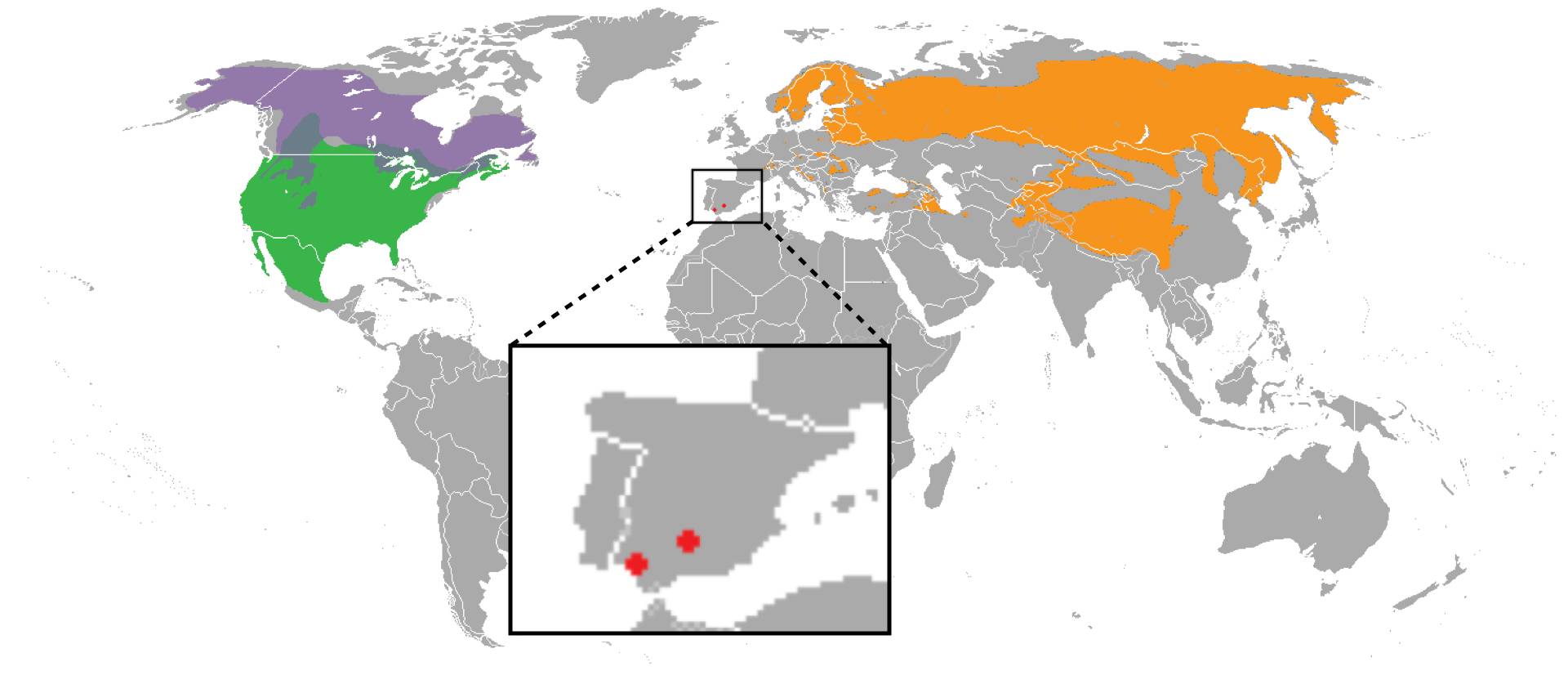 猞猁属四个物种的地理分布,只有红点标注的地区是伊比利亚猞猁的栖息地。图片:wikipedia,有改动