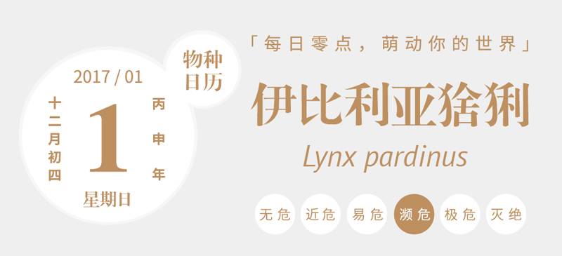 大脸盘,大长腿,耳尖激萌小毛簇,黑白相映大毛领——是的,2017年物种日历开篇要介绍的是猞猁。但是,新年第一萌,我们想说的不是领地横贯欧亚大陆的欧亚猞猁,也不是盘踞北美林海雪原的加拿大猞猁,而是它们的近亲伊比利亚猞猁(Iberian lynx, Lynx pardinus)。相比于广泛分布的姐妹物种来说,它的故事更为曲折。