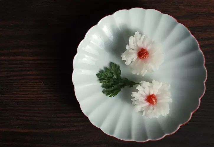 日本也有类似的萝卜雕花,一般是雕成菊花形,不过手艺潮了点,不及中国的精致,名称更是简单粗暴、引人遐想的“菊花大根”,跟松尾芭蕉那首俳句有的一比。最后呈上菊花大根一盘,请诸君品鉴。