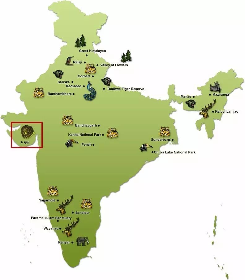 印度的森林国家公园,红色圈出的是吉尔。图片:Shoor Safaris India