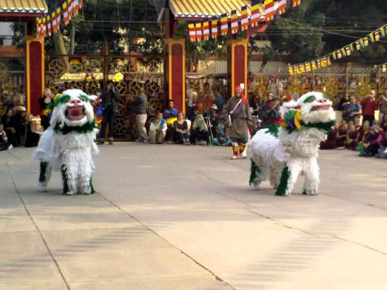 藏族雪狮舞,原型很有可能是白化的藏獒,各地的舞狮大多应来自于人们见到的圈养的狮。中国文化中的狮,还渗入了各地不同的文化元素。图片:wikipedia