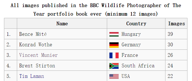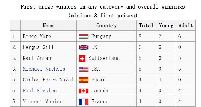 年度野生生物摄影师这个奖有多牛x呢?一个自然摄影师,照片如果能入围,那么他就能吹嘘一辈子了。但本斯·马特真是想得这个奖,就能得这个奖。他的维基百科上有这样一个统计: