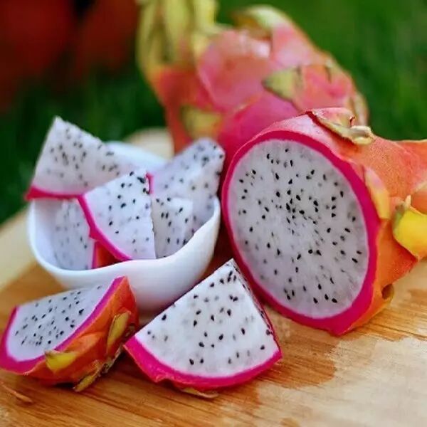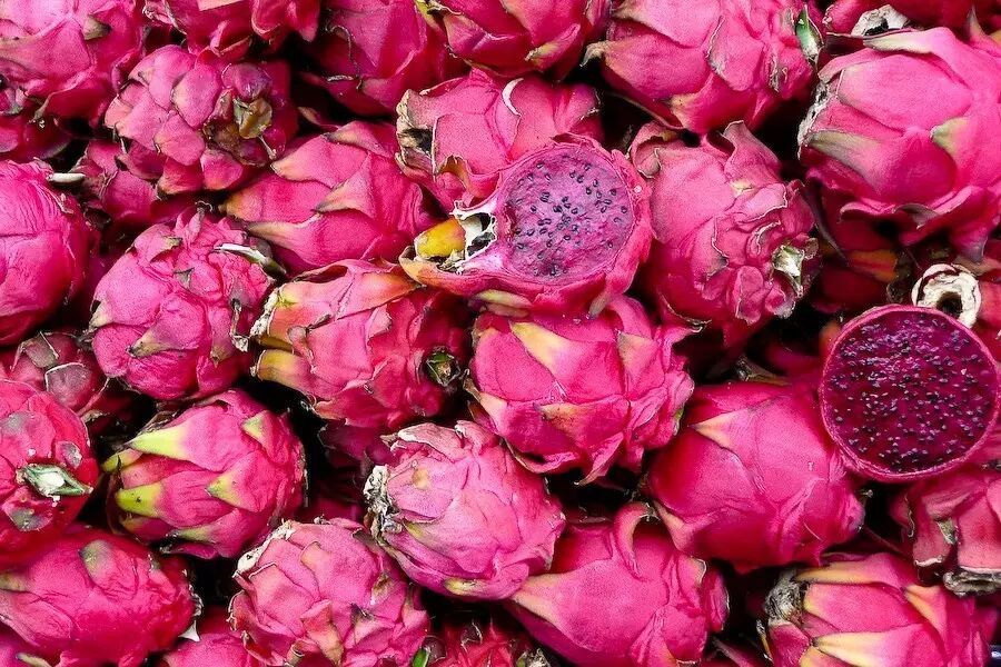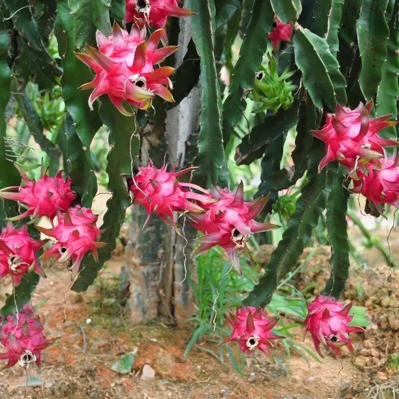成熟的量天尺果实外皮紫红,有黄绿色的鳞片,因而得名火龙果。东南亚多个国家都用类似的词称呼它,而英文的dragon fruit也是由此而来。这果实看起来养眼,味道却天生就比较寡淡。尤其是运到北方的,为了便于运输必须提前采摘,但出售时又往往催熟不足,吃起来味同嚼蜡。对此我只能说,去树上摘个熟透的试试吧,保证刷新三观,被警察骂也值得了。