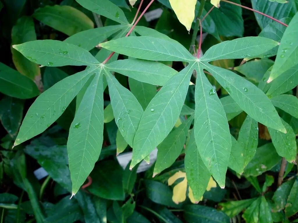 木薯的地上部分可以长到3米高,茎的下部有叶柄脱落后留下的大而明显的叶痕。叶互生,有长柄,叶片略呈盾状着生,掌状分裂,裂片少则3枚,多至9枚。