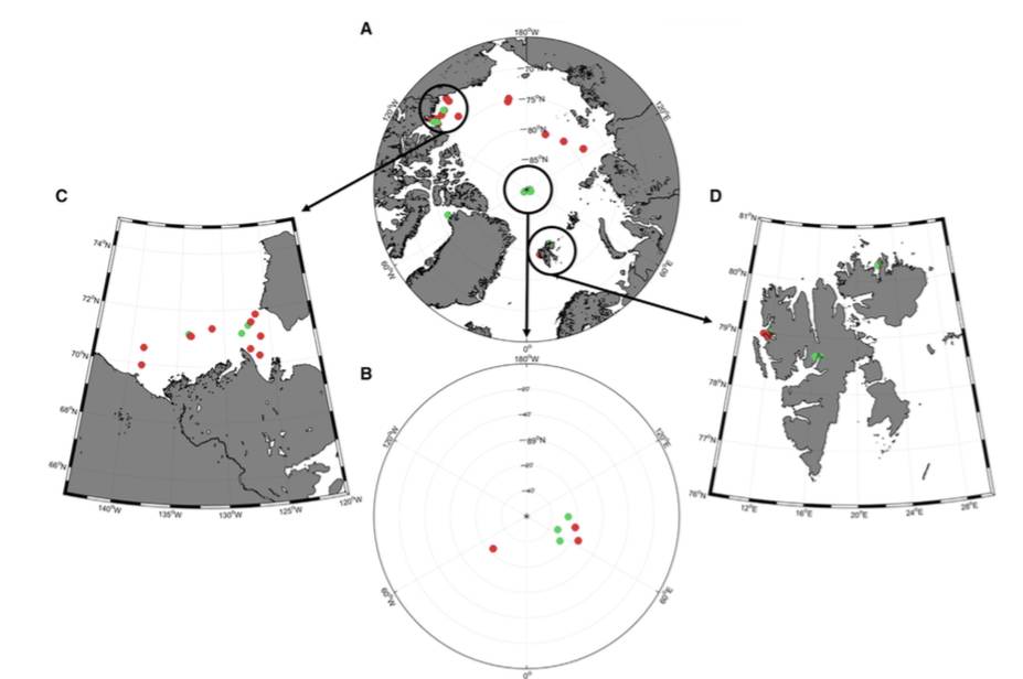 北冰洋中ADCP的采样位置。所有探测位置都处于纬度高于69°N的地区,不同位置的海拔高度以及极夜中的光照强度各有不同。其中,A图为整体概况,B图为北极点附近位置放大,C图为波弗特海(Beaufort Sea),D图为斯瓦尔巴特(Svalbard)群岛。图片:Kim S. Last., Current Biology(2016)