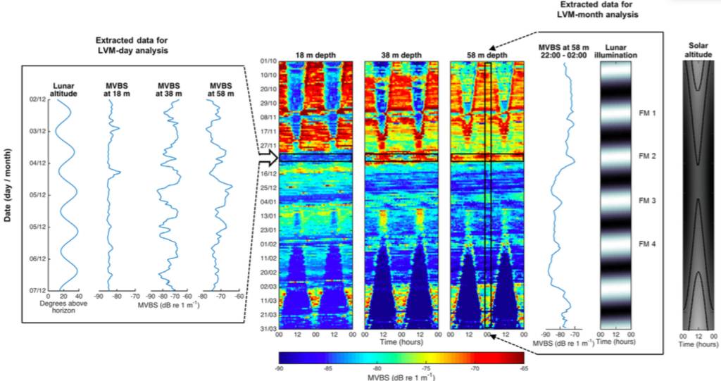 暗藏秘密的MVBS数据。中间彩色的三列数据分别从左到右展示3个不同深度(海平面下18m,38m,58m)约6个多月的数据,纵轴从上到下为日期从2006年10月1日跨度至2007年3月31日,横轴为当日的时间,MVBS数据点越接近红色代表生物量越高。在三列MVBS左侧展示的是12月2日-12月7日(此阶段见不到太阳)的月亮高度与3个深度的MVBS数据,可见从距海面38m至58m的迁徙呈现与月亮位置相一致的模式。在三列MVBS右侧展示的是在固定时间点(22:00-2:00),58m深度处6个月间的总MVBS波动,其波动高峰与满月(FM=Full Moon)的时间吻合,提示在满月时浮游动物来到深处活动。最右侧一列为太阳高度。图片:Kim S. Last., Current Biology (2016)
