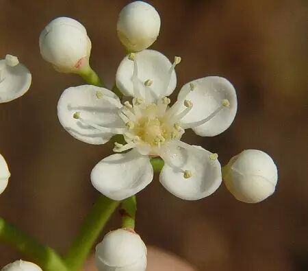 其实,不管的山楂、伏山楂还是云南山楂,都会开出白色的花朵,远远望去都只是一些分散在绿雾中的白色斑块。如果凑近山楂的花朵,你会发现这些花朵还是蛮精致的,五片花瓣之上有众多精致的栗色雄蕊,这个精致的花朵也是充满了繁殖的味道。与栗子花和石楠花相比,有过之而无不及。用这种花朵来象征纯洁的爱情,真是有点诡异的感觉。不过,这种气味儿,正是为了招揽传粉的昆虫,说到底还是为了交配,也算是一种爱情的味道吧。