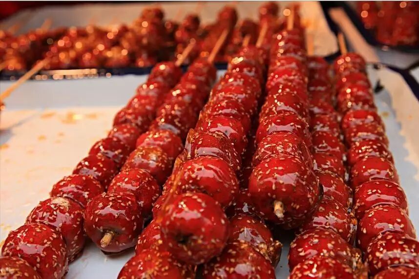 想来大概还是因为糖葫芦做法够天然。挑选通红饱满的山楂果子,最好是成熟到沙瓤状态的山楂果,用竹签子串成串。摆在案板之上,浇上熬好的糖汁,稍凉等糖汁凝固,就成了好的酸甜适口的糖葫芦。做好的糖葫芦一定要插在稻草扎成的把子上。从这把子上挑选自己心仪的糖葫芦,那种仪式感是70后和80后共同的记忆。后来,糖葫芦家族不断扩充,开始有了山药的、橘子的、蓝莓的、甚至还有香蕉的,然而在我心目中,除了山楂糖葫芦其他都是异端。