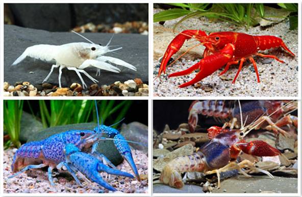 体色依次为纯白、橙红、蓝色和幽灵色的小龙虾。图片:minizoo.dk / ФЛОРА-ФАУНА / avito.ru / getshrimp.de