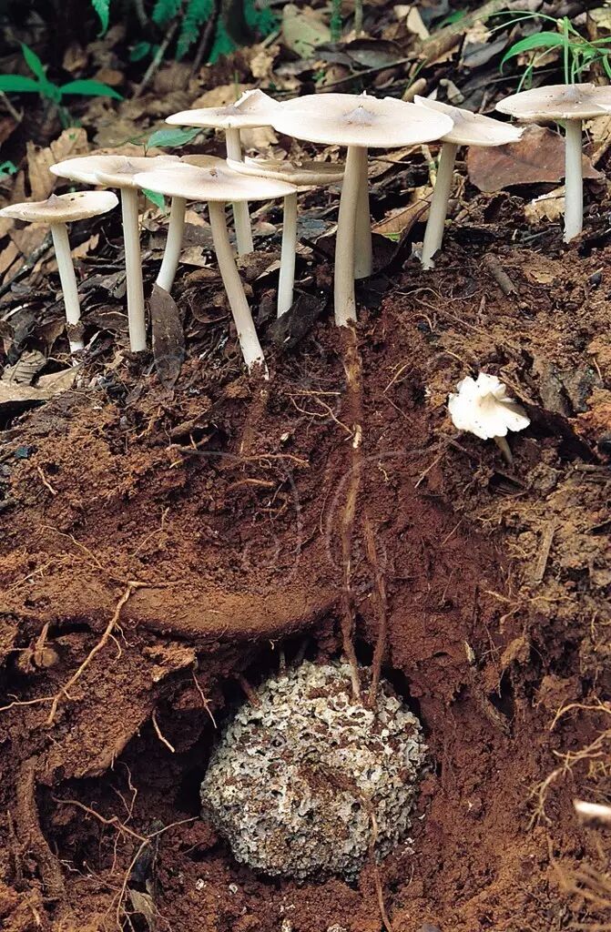 蚁巢则作为鸡㙡菌培养基提供各种营养成分。白蚁活动不仅能维持蚁巢环境稳定,抑制其他竞争性真菌以及线虫等生物对鸡㙡菌菌丝的破坏,还能帮助鸡㙡菌散播孢子。不过,在白蚁家族过于繁盛的时期,鸡㙡菌反而很难产生子实体,或许是由于白蚁对鸡㙡菌过度取食带来了抑制作用。