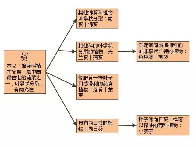 其实,叶子倾向太阳是多数植物的正常生理现象,因此冬葵(以及大豆)被挑选作为叶子向日的代表具有一定的偶然性。但既然它已经承载了这种文化意象,那就怪不得后世文人在看到向日葵未开的花盘随日转动的现象时,会不由自主地联想到“葵”。这样一来,冬葵叶子的向光性就构成了“葵”字字义在植物名称中的第三个引申方向。把现在仍在使用的带“葵”字的植物名称汇总起来,我们便可以得到一张“葵”字字义的引申关系树。
