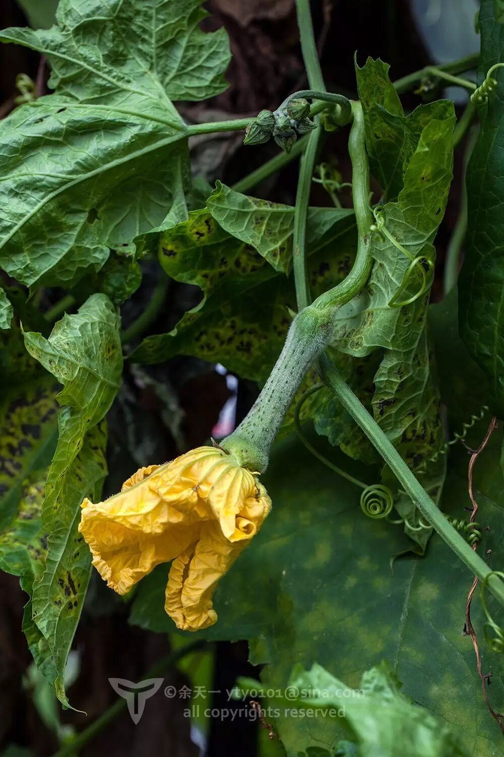 丝瓜的总状花序,雌花在最底部,通常仅一朵,比雄花开得早很多。图片:余天一