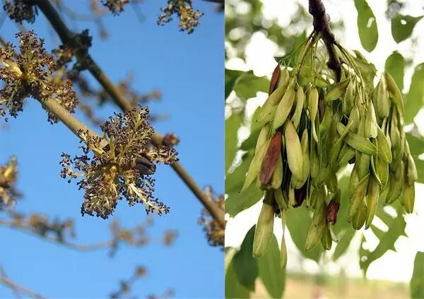 左图:欧洲梣的雄花序;右图:欧洲梣的雌花序变成的一串翅果。图片:Wikimedia Commons