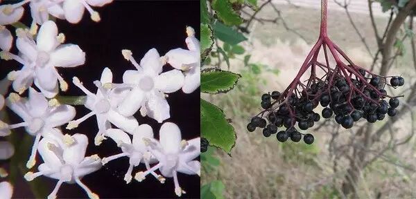 左图:西洋接骨木花的特写。它们靠蝴蝶来传粉;右图:秋天,花序倒垂成果序,深紫或黑色的浆果谦虚地低下了头。完全成熟的接骨木浆果是可以吃的,而且还是某些鸟类的重要食物,比如黑顶林莺(Sylvia atricapilla)。西洋接骨木的花和果实也被人类用来制作接骨木花露、酿酒、做果酱。图片:wikipedia