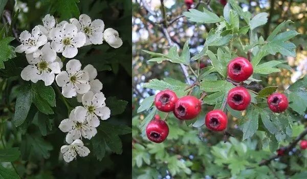 左图:暮春时,单子山楂开花。虽然也有些香气,但是来传粉的不是蜜蜂,而是蚊蚋一类的虫子。 右图:在收获的季节,单子山楂也发出红果果的炫耀贴,而且是立马就能吃的无毒绿色食品。图片:wikipedia