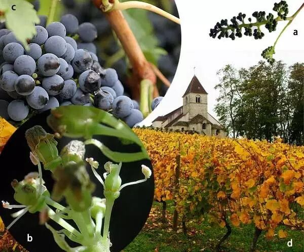 普通葡萄(V. vinifera)应该没有人没见过吧?可是葡萄的一年又是怎样度过的呢?a:葡萄的圆锥花序上打满了花骨朵儿;b:盛开的小花,花冠是整体脱落的;c:熟透的紫色葡萄,表面有白粉;d:勃艮第秋收后的葡萄园。图片:Wikimedia Commons