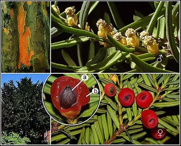红豆杉也是雌雄异株,雌株会结出一个个红亮的小果果,这也是“红豆杉”名字的由来。图中左上为片状脱落更新的树皮;右上为雄球花,右下为雌球花;放大图中a为种子,b是由珠托发育而来的假种皮。图片:agroatlas.ru