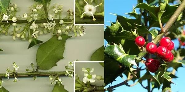 左图:欧洲冬青是雌雄异株,靠蜜蜂传粉;右图:秋天,欧洲冬青发出了红果果的炫耀贴。不过这时它的果实,口感比较苦涩,而且也是有毒的。爱吃果子的鸟儿们必须耐心地等到冬天再下嘴,经过霜冻的果实就会变软可食用了。图片:Wikimedia Commons