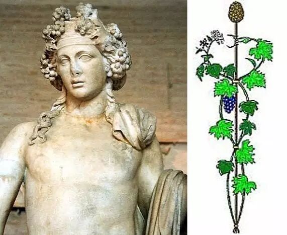 左图:头上挂满葡萄的狄俄尼索斯;右图:酒神的手杖。图片:squidoo.com