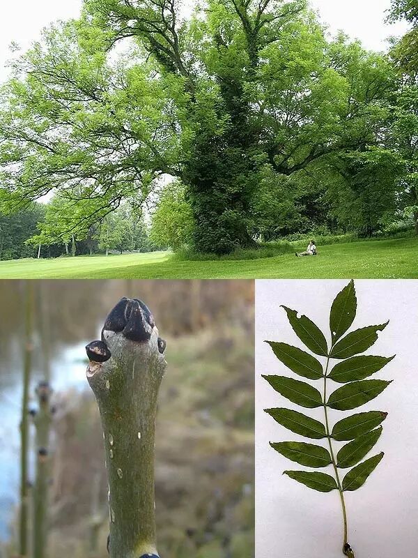 左图:它的树枝灰绿色,长着乌黑的芽。这也是欧洲梣(F. excelsior)区别于其他大部分梣树的标志特征。右图:欧洲梣的羽状复叶。图片:Wikimedia Commons