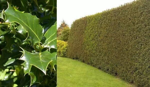 左图:欧洲冬青的叶子有棱有角;右图:欧洲冬青是常绿树,能长10-25米高,种个冬青树篱,堪比高墙铁丝网,还环保低碳呢。图片:Carl Farmer/plant-identification;nzplantpics.com