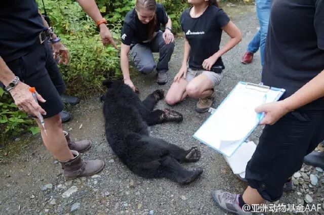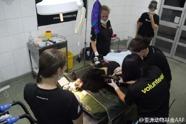 为了尽早救治小熊,我们迅速将她装上卡车赶回救护中心,一面沿途为她输液补充水分、一面密切观察她的情况。晚上9点多,我们终于到达中心。但工作人员没有心思休息,又立即投入到手术当中。