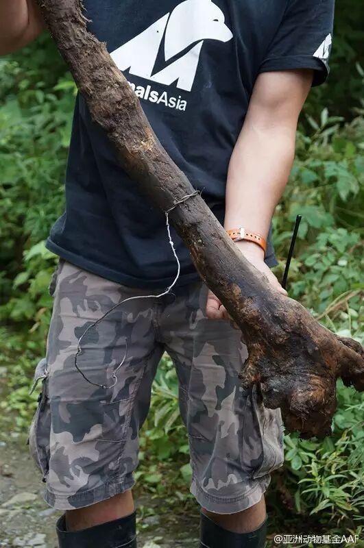 我们将小熊麻醉之后先剪断了套住她的一段铁丝网。保护区的工作人员查看之后判断应该是非法自制的捕兽工具。他们当即把铁丝套作为证据留存,将带回去做进一步调查。据我们的推测,小熊应该是在别处踩进这个陷阱,受伤之后拖着套铁丝的木桩忍痛奔跑,最后因为树桩被卡住、才动弹不得。